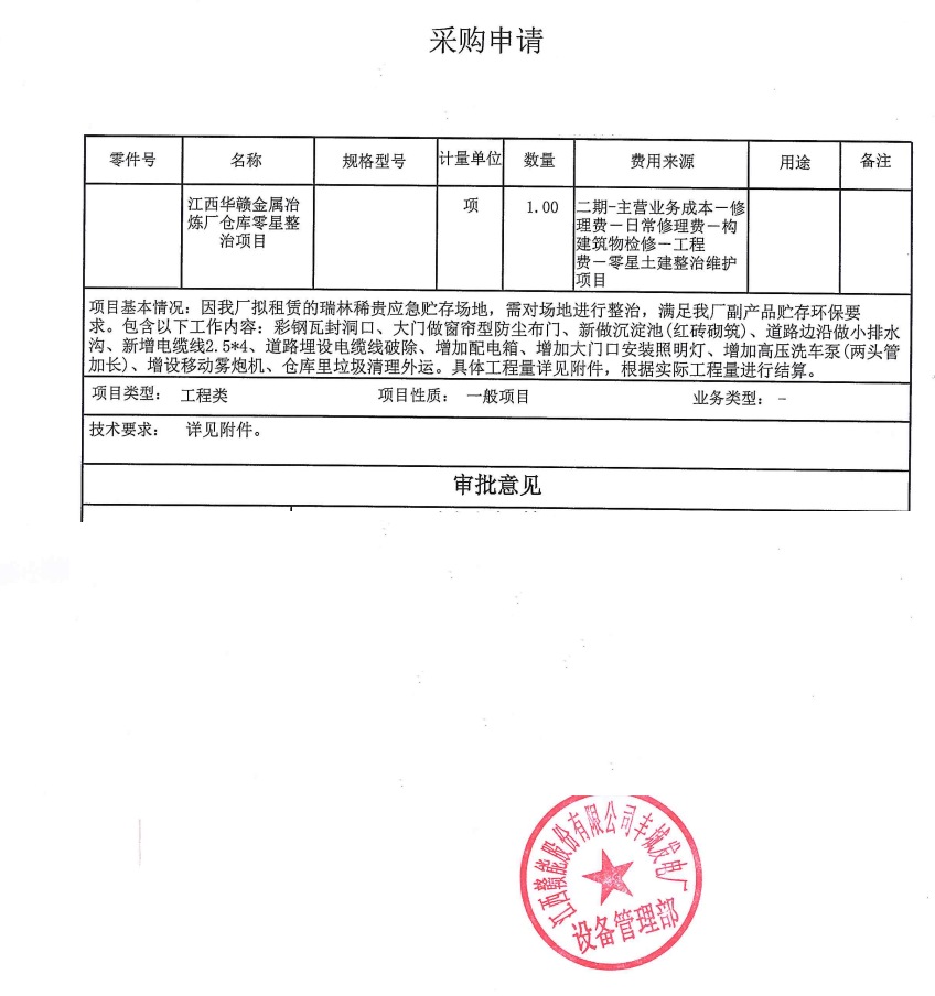 依据江西赣能股份有限公司丰城发电厂采购计划,对江西华赣金属冶炼厂仓库零星整治项目进行询比采购,欢迎合格的供应商前来参加。